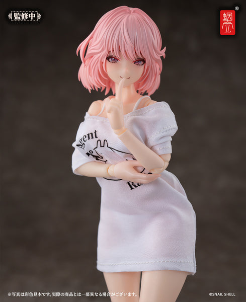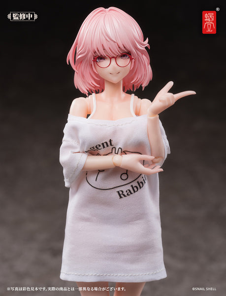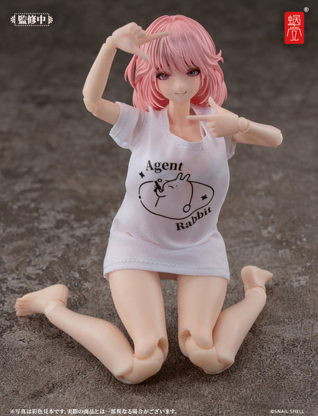 Snail Shell's original character, the bunny girl Aileen, is back in comfortable loungewear for a relaxing day off! She comes with two interchangeable faces, each with fully movable eyeballs; a Mini Tool NEO is included to change the direction of her gaze. She also has five sets of interchangeable hands, and she wears a comfortable oversized T-shirt that's made of fabric! A headband with bunny ears is included, as is a removable bra. A set of "floating" interchangeable feet are also included, so Aileen can be displayed in completely relaxed mode! Three sets of photo-etched glasses are also included. This action figure is produced using a mold made with the industry's most advanced five-axis machining equipment, so even the finest details are perfectly reproduced. Her base is included too. Aileen would love to spend her day off with you -- order her for your own collection today!