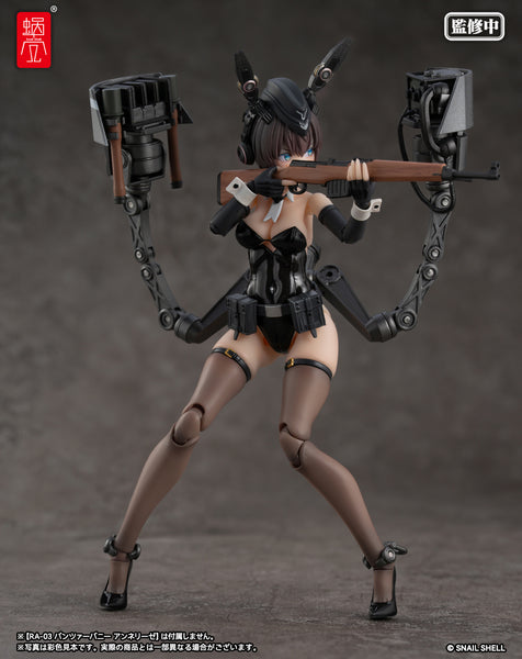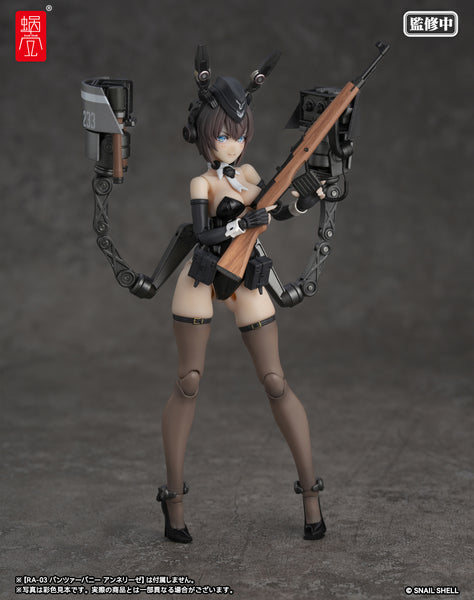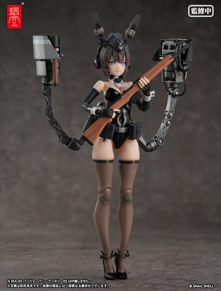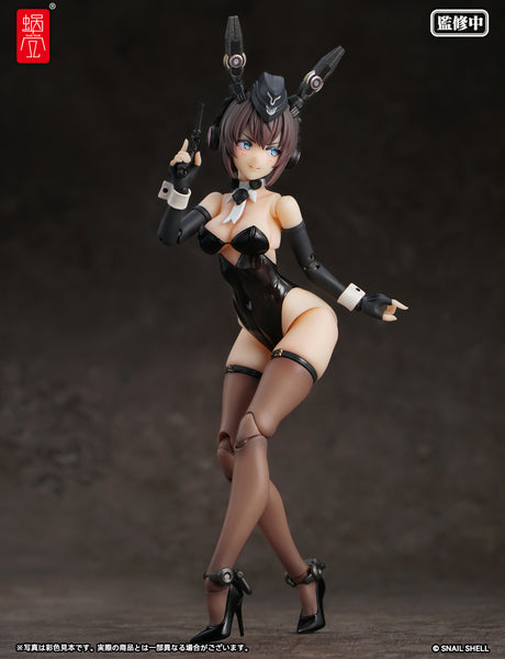 Snail Shell brings us their newest original character -- say hello to Panzer Bunny Anneliese! She's a casino dealer, a vigilante, and the vice captain of the Spade Squad! She comes with two interchangeable faces -- an open-mouthed smile, and a grim smile with a closed mouth -- and her eyes are movable for greater expressiveness, thanks to the Mini Tool NEO that you can use to change the direction of her gaze! Five sets of interchangeable hands are also included. The bottom of the bunny tail attached to her body has a 3mm-diameter hole which can be connected to the support arm of the included base for greater freedom of posing. Her mecha rabbit ears are posable, too, and they're loaded with detail! Her garrison cap has a built-in magnet, so it can be attached and detached freely. Her bunny suit is glossy for a leather-like appearance; its contrast with her pale skin makes her even more charming! Her thigh-high stockings are painted with great care, too. Order her for your own collection today!