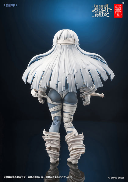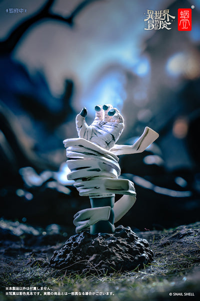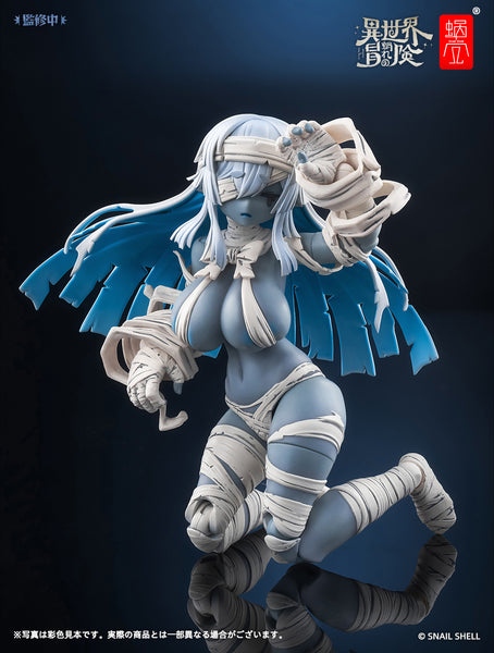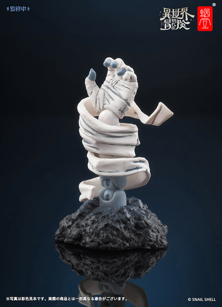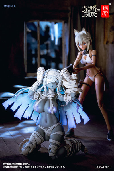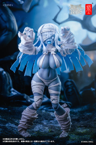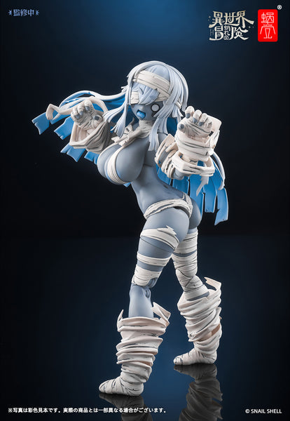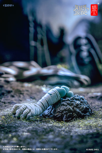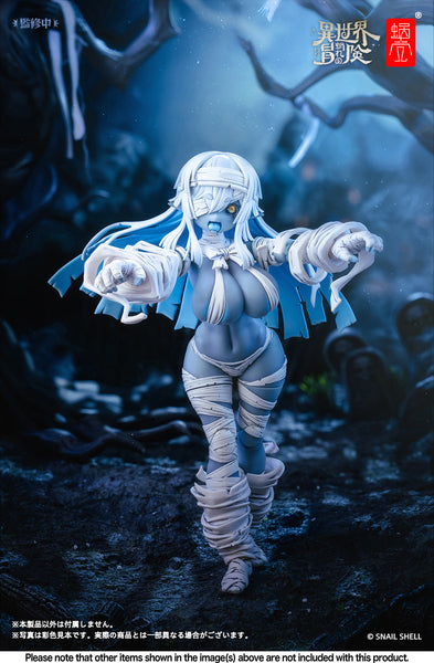 Zombie Grisa is the third installment in Snail Shell's original action-figure series, "My Otherworldly Adventure" -- and she's ready to join your collection! She's fully posable for maximum spooky fun, and she comes with three interchangeable faces: an expression with her mouth open, a surprised face, and a frustrated look. The face with the open mouth features movable eyeballs -- use the included Mini Tool NEO to change the direction her eyes are looking! Three sets of interchangeable hands are also included; in addition, her arms are removable, and a broken bone part is included that can be attached to her upper arm to express a broken arm! She can also hold one of her detached arms and use it as a weapon! Blue-based paint was used for her eerie skin tone, and the bandages she wears are packed with detail for a realistic texture. Her body is newly designed to emphasize her marshmallow-like softness, too! A pile of soil parts is included, and if you remove her arm and attach it to the hole in the pile of soil, you can recreate the scene where she resurrects from underground! Order her for your own collection today!