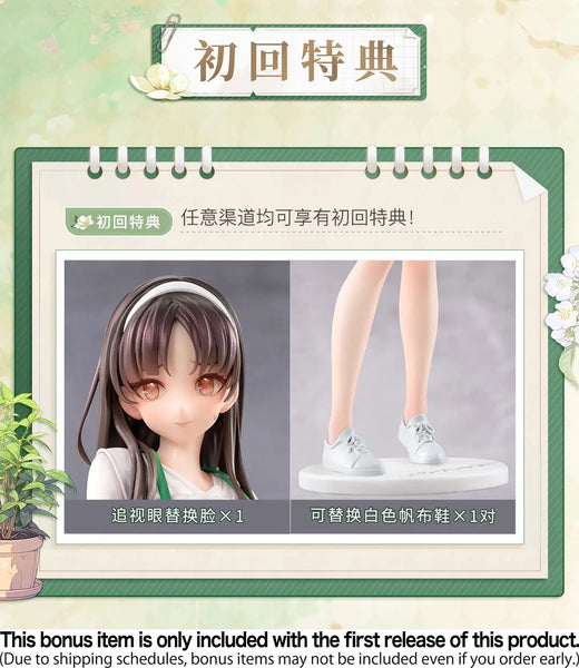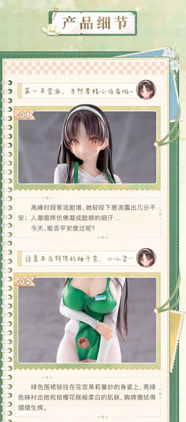Animester presents Mari from their original work "First Business! Mari Hanamiya the Gentle Shop Assistant"! You're her very first customer! Mari wears a green apron and a nervous yet excited expression; her slightly awkward pose is very endearing, as is her slight blush! The first batch of this figure will include an interchangeable face with tracking eyes, and a pair of white sneakers as a special bonus! (These items are only included with the first batch of this figure; if yours does not include them, it was not part of the first batch.) Her base is included too. Order Mari for your own collection today!