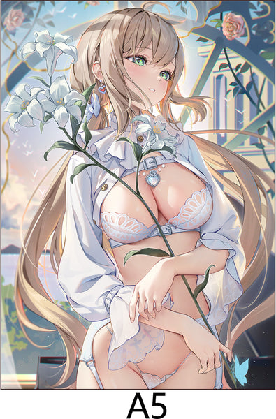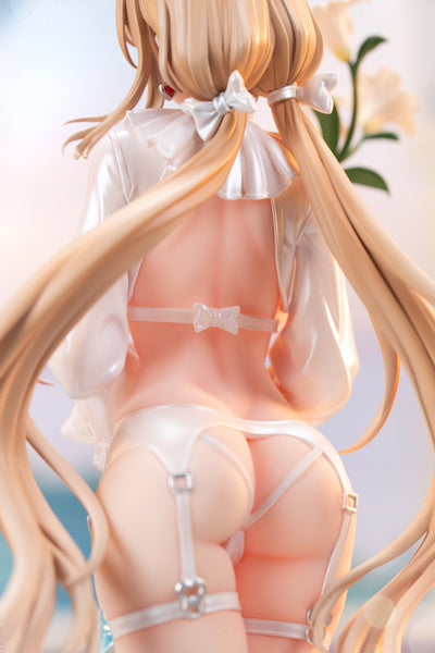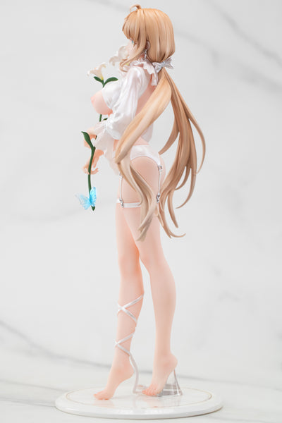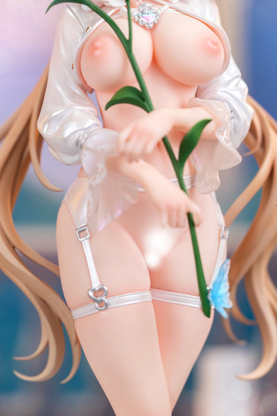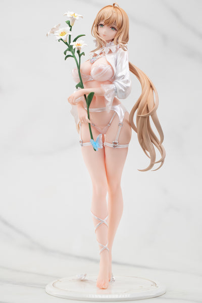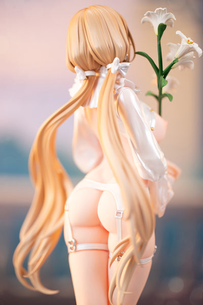 Her Love brings us a lovely figure of their original character, Momoko-chan! With her long blonde hair swirling softly behind her, she wanders dreamily through a garden, carrying a large stem of white lilies with a tiny blue butterfly clinging to the end; she can be displayed with or without her lingerie for less coverage if you prefer, and her base is included. This figure features flocking on the interchangeable lower body part for extra realism, and this EX version includes a bonus of a 3D hologram poly board of the original illustration that inspired this figure, and a wall tapestry too! Order her for your own private collection today!