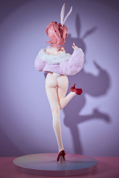 Oops -- she almost missed her cue! Rabbi runs onstage just in the nick of time! Her fluffy lavender jacket with white trim emphasizes the sleek fit of her pearlescent bunny outfit and her slender form; her wide-gauge fishnet stockings and super-high heels in bright red showcase her lovely legs, too! Her surprised expression is incredibly cute as well, and she comes with a base. This adorable 1/6-scale figure from Fingle Toy is based on an illustration by the popular illustrator rurudot. Order her for your own collection today!