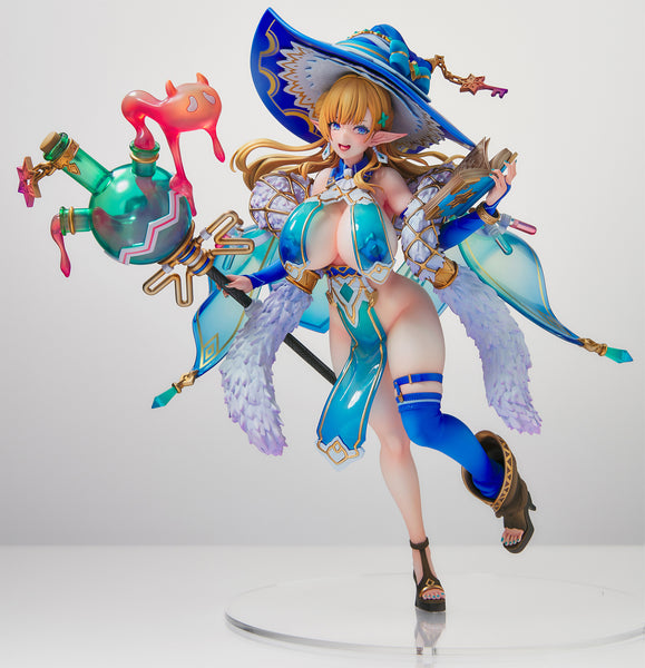 Milklinde, the Elf Village's apprentice alchemist, is now a beautiful figure from Vertex! She was designed by Nidy-2D, so you know she'll be super cute! Unlike her cousin Lulunia, she's not so good at sports -- but she's really good at studying, and she's become so knowledgeable that the whole village is amazed! She's succeeded in creating a "slime that dissolves anything" -- and she's preparing to go out to conduct experiments with it today, equipped with her special staff! She can be displayed with or without her large tricorne hat and fluttering cloak if you prefer. Her base is included too, as are special support parts. Order her for your own private collection today!