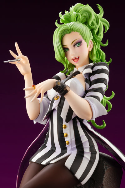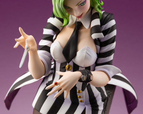 Kotobukiya's awesome "Bishoujo" version of the iconic Beetlejuice, from the 1988 film of the same name, is back! Shunya Yamashita designs Beetlejuice with a strong makeup scheme and a half-up ponytail to bring out her free-spirited personality and energy; you'll love her sassy expression! She's seen filing her nails as she leans against a significant tombstone; the black-and-white-striped jacket has transformed into a stylish swallowtail coat, and she also wears multiple watches! Order her for your own collection today!