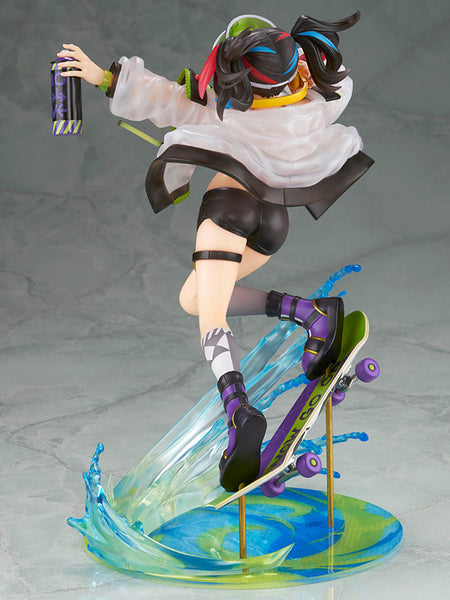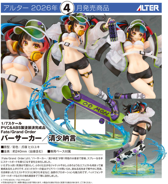 Berserker/Sei Shonagon from "Fate/Grand Order" appears in Alter's figure lineup wearing her First Ascension swimsuit! She's seen riding a skateboard with a spray paint can in hand; the motion of her puffy jacket and twin tails, along with the colorful clear splash effects, give the figure a dynamic feel. You'll love her mischievous smile, and all her accessories, such as her headphones, shoes, and skateboard, have been carefully sculpted down to the smallest detail. Display her anywhere you'd like to see some summertime action -- order her for your own collection today!