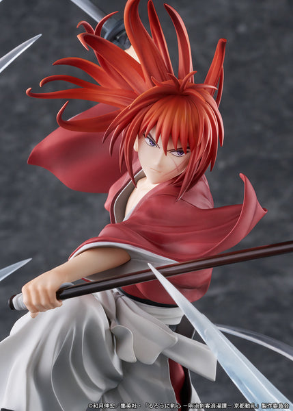 Proof brings us an outstanding figure of Kenshin Himura from the TV anime "Rurouni Kenshin: Meiji Swordsman Romantic Story: Kyoto Uprising," demonstrating his "Souryusen" two-stage sword-drawing technique! His smoothly flowing kimono and hair express the trajectory of the move, and clear effect parts and autumn leaves emphasize its impact! This action-packed figure would look amazing on your shelf -- place your order today!