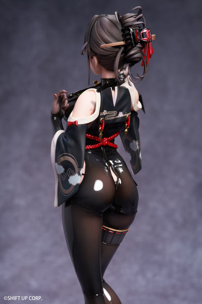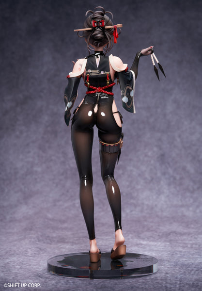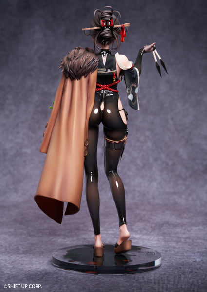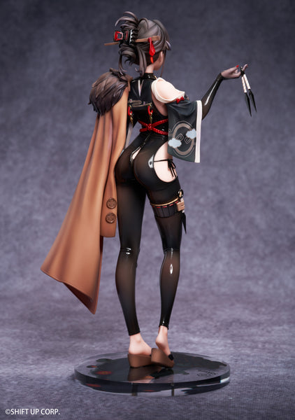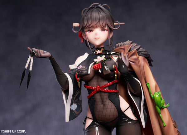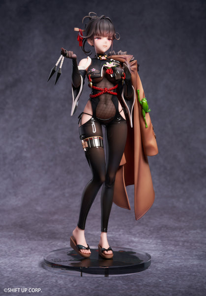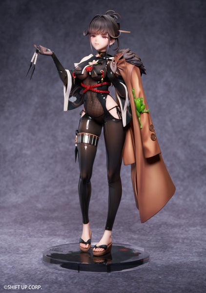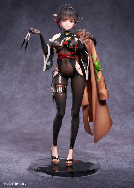 Sakura from "Goddess of Victory: Nikke," wearing her "Midnight Stealth" outfit, is now an outstanding figure from Hobby Sakura! She dangles two kunai from her right hand, looking down with a contemptuous expression. A holster on her right thigh holds more kunai at the ready; she also has a long coat that she can wear draped over her left shoulder. This deluxe version comes with a wall tapestry of the illustration that inspired this figure! Her base is included too. Order her for your own collection today!