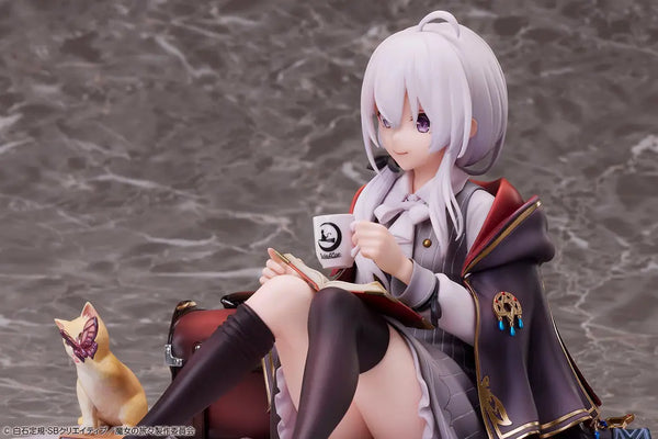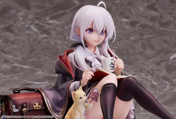 Elaina, the beautiful genius "Ashen Witch" from the TV anime "Wandering Witch: The Journey of Elaina," is now a peaceful figure from Design Coco! This figure is based on an illustration by Azuru; it perfectly captures her distinctive gray hair, her relaxed smile, and her outfit, as well as her bag and stack of books. A cute kitten is seated nearby to keep her company, and she comes with a base that resembles a soft cushion. This figure would look great displayed in your own library -- order her today!