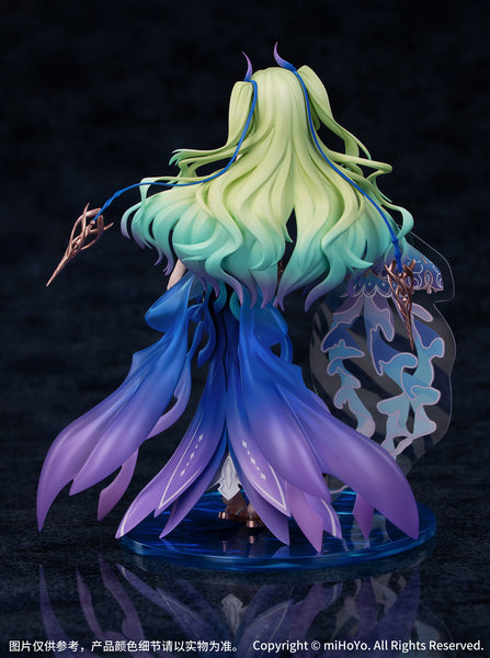 Mobius from the popular action game "Honkai Impact 3rd" gets a new "Gift+" figure from Myethos! She wears her "Daughter of Corals" costume, with a skirt that gives her a mermaid-like appearance. She leans her right hand on a vivid jellyfish, and the golden accessories accentuate the deep blue color of her skirt. Her hair changes from pale green to a beautiful purple; her base features subtle rippling waves with a thin layer of pearl paint for a sparkling effect. This figure will be a standout in your collection -- order her today!