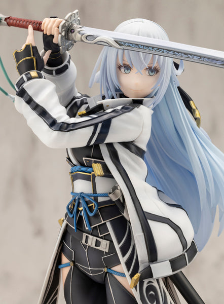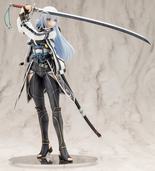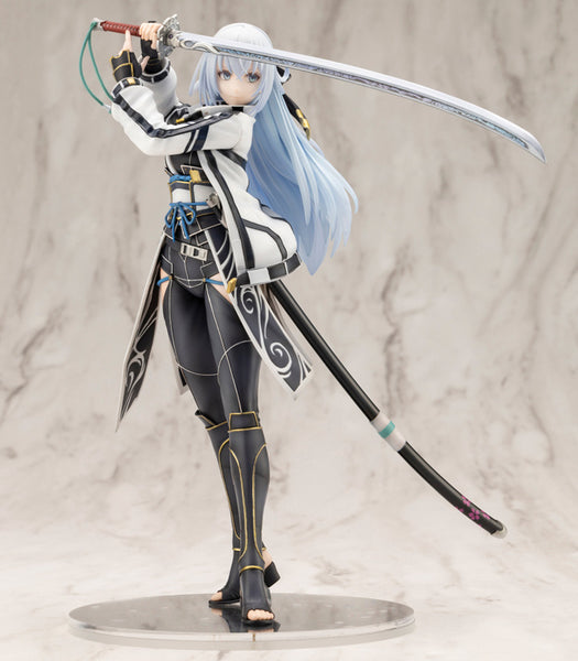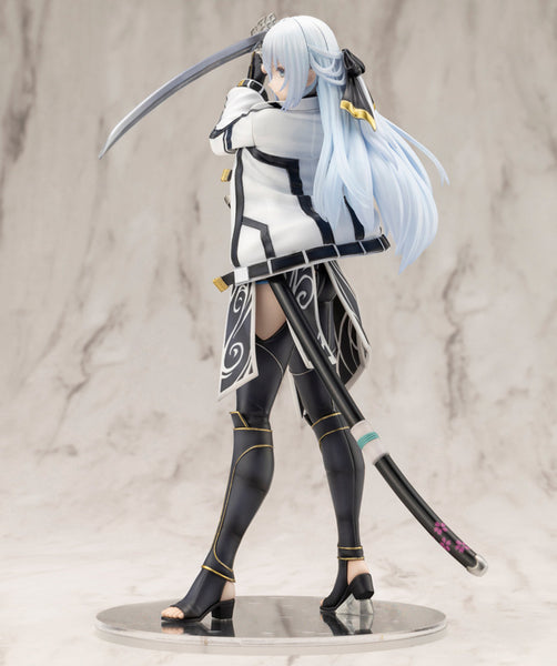 Shizuna Rem Misurugi from the hugely popular game series "The Legend of Heroes" finally gets her first figure, thanks to Kotobukiya! The vice-commander of the strongest samurai group Ikaruga, and a user of the Kurokami Itto-ryu style, she's also known as the Silver Sword Saint. She wears the reinforced suit she wears in "The Legend of Heroes: Kuro no Kiseki" and other games, and has been sculpted in her iconic stance. Every detail has been carefully reproduced, from her childlike facial features to her lustrous silvery-blue hair to her jet-black odachi sword Akegarasu, which is almost as tall as she is! Her base is decorated with pink petals dancing in the air, reminiscent of the S-Craft Imperial Technique: Zero MoonFlash. Some minor assembly is required. Order her for your own collection today!