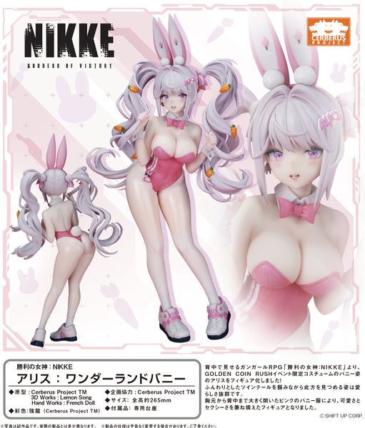 Alice from the popular RPG "Goddess of Victory: Nikke" gets a new figure from Flare, wearing her "Wonderland Bunny" costume! This outfit was exclusive to the GOLDEN COIN RUSH event in the game. She's super-cute in her snug pink bunny outfit, clutching her twin tails and giving you a slightly shy smile; the carrot-shaped hair ornaments and her casual sneakers make her even more adorable! Her base is included. Order her for your own collection today!