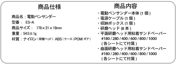 Product Specifications:Product Name: Electric Pen SanderModel: ES-ADimensions: 178 x 21 x 18mmWeight: 54.5gMaterials: Nylon (polishing head), ABS (case), POM (gear)